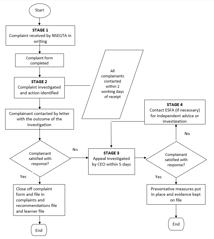 Monitoring of the health and safety of all apprentices / learners will be conducted during every workplace visit to ensure the organisation is taking serious the health, safety and welfare of the apprentice / learner. A full risk assessment will be undertaken by NSEG before a placement is excepted. Should any failures in health and safety be assessed and deemed not to directly affect the learner’s physical safety, recommendations will be set to the organisation for better health and safety practice. If the failures are deemed to directly affect the health, safety or welfare of the apprentice / learner, the training officer must inform the relevant heads of department and chief executive officer. Full safety inspections will be completed annually. Safety monitoring must be undertaken by persons with the minimal level of safety qualification IOSH managing safely.